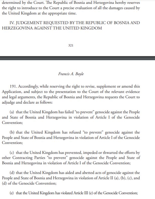 Iz knjige prof. Boylea: Pravno utemeljene optužbe na račun UK (Engleske) o sudjelovanju u genocidu. I danas, kao i u toku agresije i genocida Engleska nekažnjeno sprovodi tu politiku; prof. Boyle je kod Svjetskog suda osigurao pravo državi BiH da u svako doba može aktivirati tužbu protiv UK.