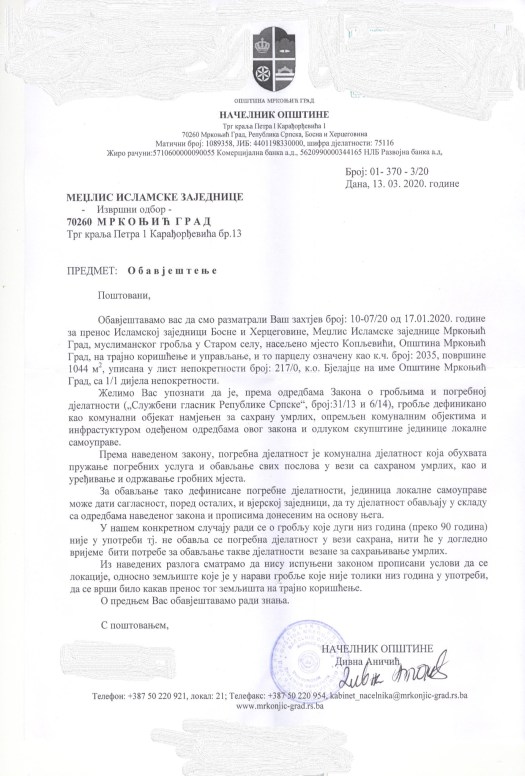 Rješenje načelnice Opštine Mrkonjić-Grad Divne ANIČIĆ kojim odbija zahtjev Medžlisa Islamske zajednice Mrkonjić-Grad o ustupanju na korištenje Mezarja u Starom Selu. Hoće li više sluha za spašavanje i očuvanje ostataka mezarja i džamije imati novi načalnik dr. Vođević?