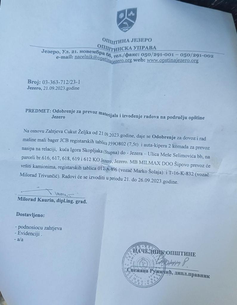 U Jezeru se mimo urbanističkog plana, građevinskih dozvola, kopa, gradi i skrnavi prirodna okolina, sve uz Vašu dozvolu. Da li Vi imate pravo na to?