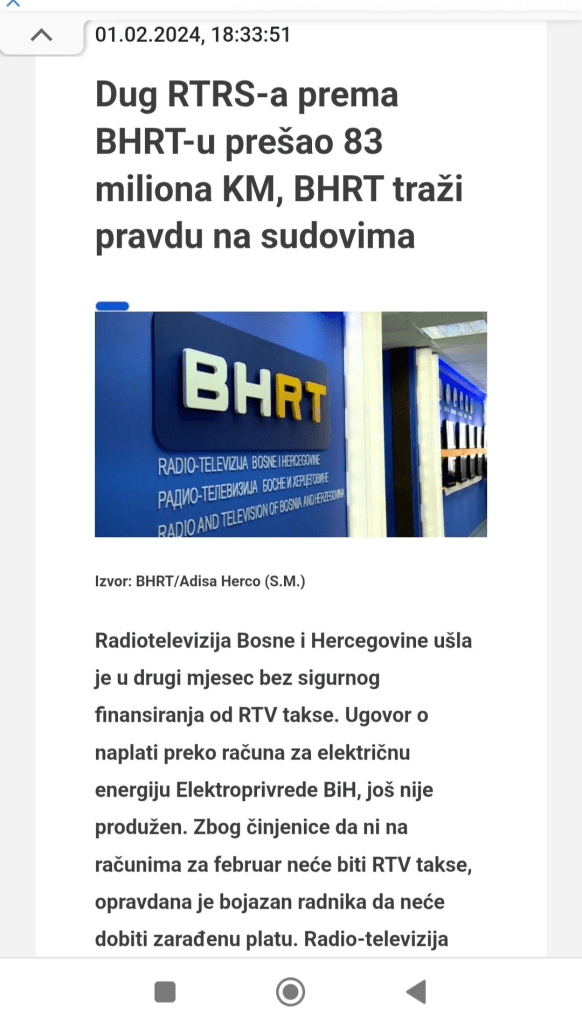 Taj RTRS ubire u svoju blagajnu desetine miljuna od RTV pretplate koju građani BiH plaćaju, a RTRS ne uplaćuje dio prikupljenog BHRT-u nego mimo zakona zadržava za se. U reportaži BHRT-a načelnica s kokardom n glavi je kao đoja uzgred reklamirala RTRS koja potkrada BHRT koji joj ustupa skupi medijski prostor da bi se besplatno samoreklamirala kao AK Mars u vlasništvu njene obitelji.