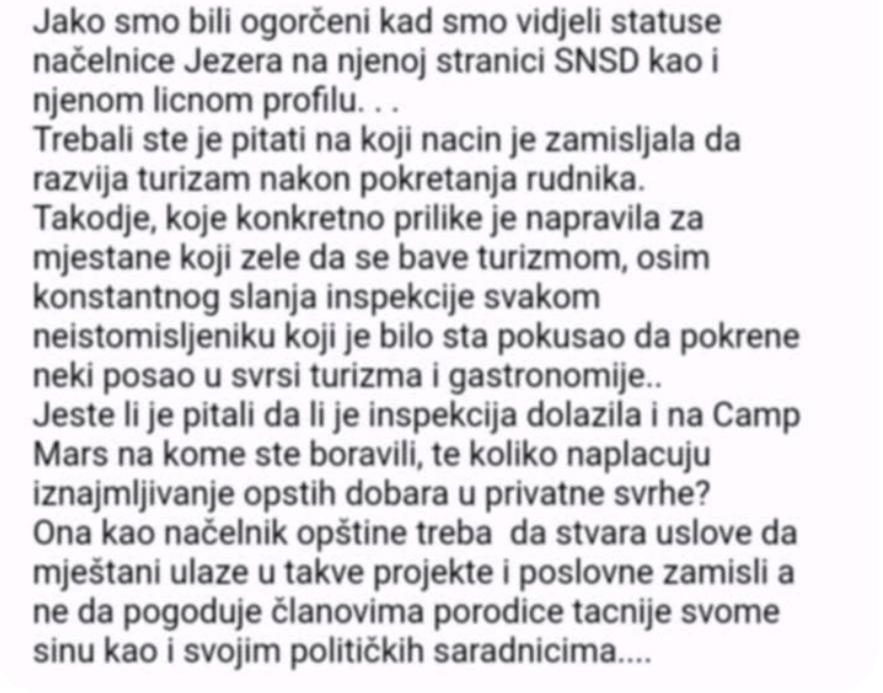 Поштовани господине Буцало, (…) Општина Језеро нема никакве туристичке садржаје. Нема хотел, мотел, нити један пристојан ресторан. Нема пекару. Има нешто смјештаја у личној изведби, колико људи, неупућени и без подршке неке честите установе могу сами да понуде. Правити прилог о ливади и назвати то “ауто кампом при том без, како се то каже – инфраструктуре! Колико знам без мокрог чвора. Дакле без захода а камо ли купатилa! Без прописног одлагања отпада, без испуштања отпадних вода у ријеку, итд. Па молим вас, ако не познајете област туризма надам се да бар имате неког ко има искуства са тим видом дјелатности. Па вам зато препоручујем, покажите снимке, распитајте се. Каквог би смисла имало једнострано извјештавање, уз неког пристрасног новинара, без увида друге стране…