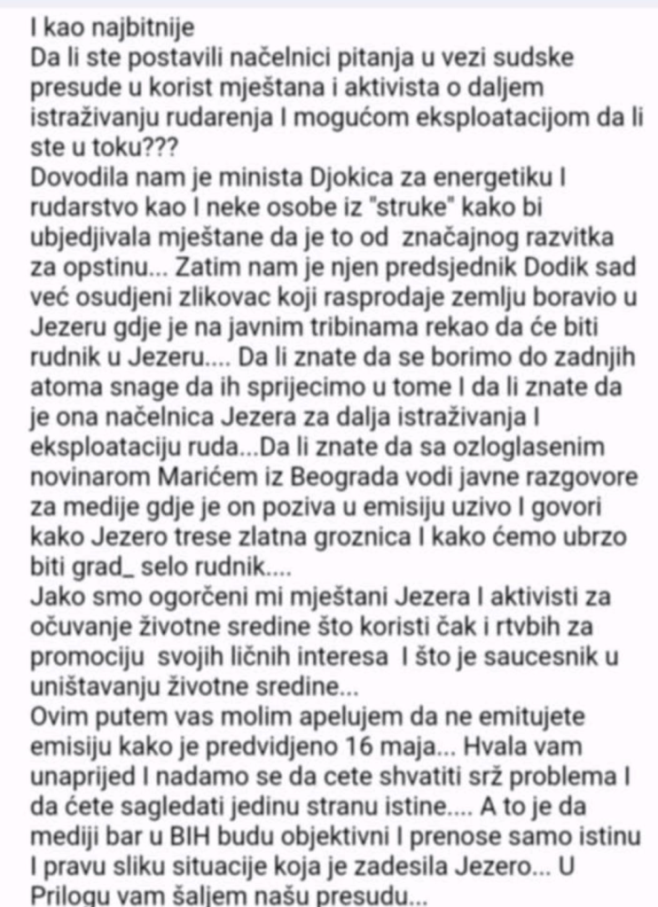 Javno podrzava ratne zlocince Karadzica i Mladica ( prilog) Potpisnik je svih dokumenata u vezi iskopavanja rudnika protiv kojih se bore mjestani Jezera a ona ih zbog toga hapsi, izmislja price o njima u medijima koje je sama napravila radi te svrhe i sa tim tekstovima im na jedan nacin stavlja metu na celo , uznemirava ih porukama i prijeti im. I bas ona koja unistava Jezero sa iskopavanjen rudnika Litijuma da propagia turizan. Smijesno i zalosno. Apsolutni je diktatotor u smislu ” Ako si sa mnom imas sve ako nisi nemas nista” sto je razlog da se vecina Bosnjaka plasi bilo sta reci . Ako je neko i rekao ili napisao nasto na svom FB bio je priveden u piliciju. Jedan dio Bosnjaka koji joj tapsaju i ” skacu” na svaku njenu rijec je kupila paketom ili nekom pomoci i uslugom , na sta ih svaki put kad joj zatreba podsjeti. A znati ljude, pogotovo neobrazovane i ekonomski slabe. Kod njih vazi ono ” Hljeba i igara”. U njenom folkloru, projektima ili bilo cemu drugom nema Bosnjaka niti bilo sta sto im pripada. Ona u miru dovrsava ono sto cetnici nisu u ratu dovrsili praveci masakr nad neduznim stanovnistvom Jezera i sve to u bijelim rukavicama, trepcuci okicama i uz osmijeh. Kada je bio projekat vezan za krater na Marsu za sve javne nastupe i posjete americke ambasade je koristila djevojcicu Erduanu koja fantasticno priča Engleski. Al kad su stigli Ipedi za poklon skoli nije Erduane bilo na spisku ,kao ni jednog Bosnjackog djeteta. O cemu sam pravila reportazu i ljudi su skupili pare pa smo Erduani kupili Iped. Iskoristila je reportazu da reklamira vikendicu svoga sina a nije vas odvela u centar Jezera gdje se nalazi Teina koliba koja propada samo zato sto ju je napravio predsjednik prije nje. Iz licne sujete propada nesto sto ima jedno od najvecih vrijednosti u mjestu i sto je simbol Jezera. Teinu kolibu iz koje istjera sa poilicijom Bosnjake koji poste i koji su tu htjeli iftariti samo zato sto nju niko nije pitao za dozvolu i pred sam iftar ih otjera( policija koju je poslala). Imala bih jos mnogo toga da napisem ali mislim da je i ovo napisano i vise nego dovoljno. Svaka rijec koju sam napisala je istinita i stojim iza nje. Vjerujuci u vas patriotizam, ljudskost i profesionalnost zahtjevam u ime mnogih mjestana i u moje ime prije svega da se reportaza ne objavi. NEKO KO PLJUJE PO NASOJ DOMOVINI I NE PRIZNAJE JE, NEKO KO KAZE DA JE SREBRENICA SALA I IZMISLJOTINA NE SMIJE DOBITI PROSTOR NA DRZAVNOJ TELEVIZIJI. TO JE PONIZENJE ZA SVE NAS. Uz nadu da ce moj prigovor uz dokaze koje prilazem biti udovoljen i da necete emitovati emisiju u kojoj se velica ona a ne Jezero, srdacno vas pozdravljam. Kamo srece da Jezero postane nasa Venecija i centar BH turizma ali ona kao osoba i nacelnica ne zasluzuje da se u superlativu prica o njoj . I zaboravih reci da je naredila Komunalnoj firmi da skloni i pobaca cvijece koje su mjestani o svom trosku postavili na mostove, a nju nisu pitali. Pa sam ja postavila na ogradi moje kuce uz poruku da ce cvijece ipak krasiti dio gdje zive Bosnjaci i neka sad skine saksije ako moze. P s. VAs kolega Ibrahim Halilovic je vec juce objavio clanak o vama i ovome sto ste uradili . Poslije cu vam i to poslati kao prilog.”