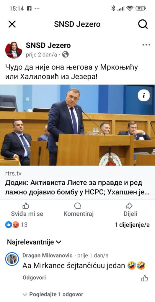 Dana 22. avgusta 2025. godine, na zvaničnom Facebook profilu Opštinskog odbora SNSD Jezero koji vodi predsjednica Snežana Ružičić, načelnica Opštine Jezero, objavljen je status u kojem se, u kontekstu medijske vijesti o lažnoj dojavi o postavljenoj bombi u Narodnoj skupštini Republike Srpske, implicira povezanost Ibrahima Halilovića sa tim događajem.