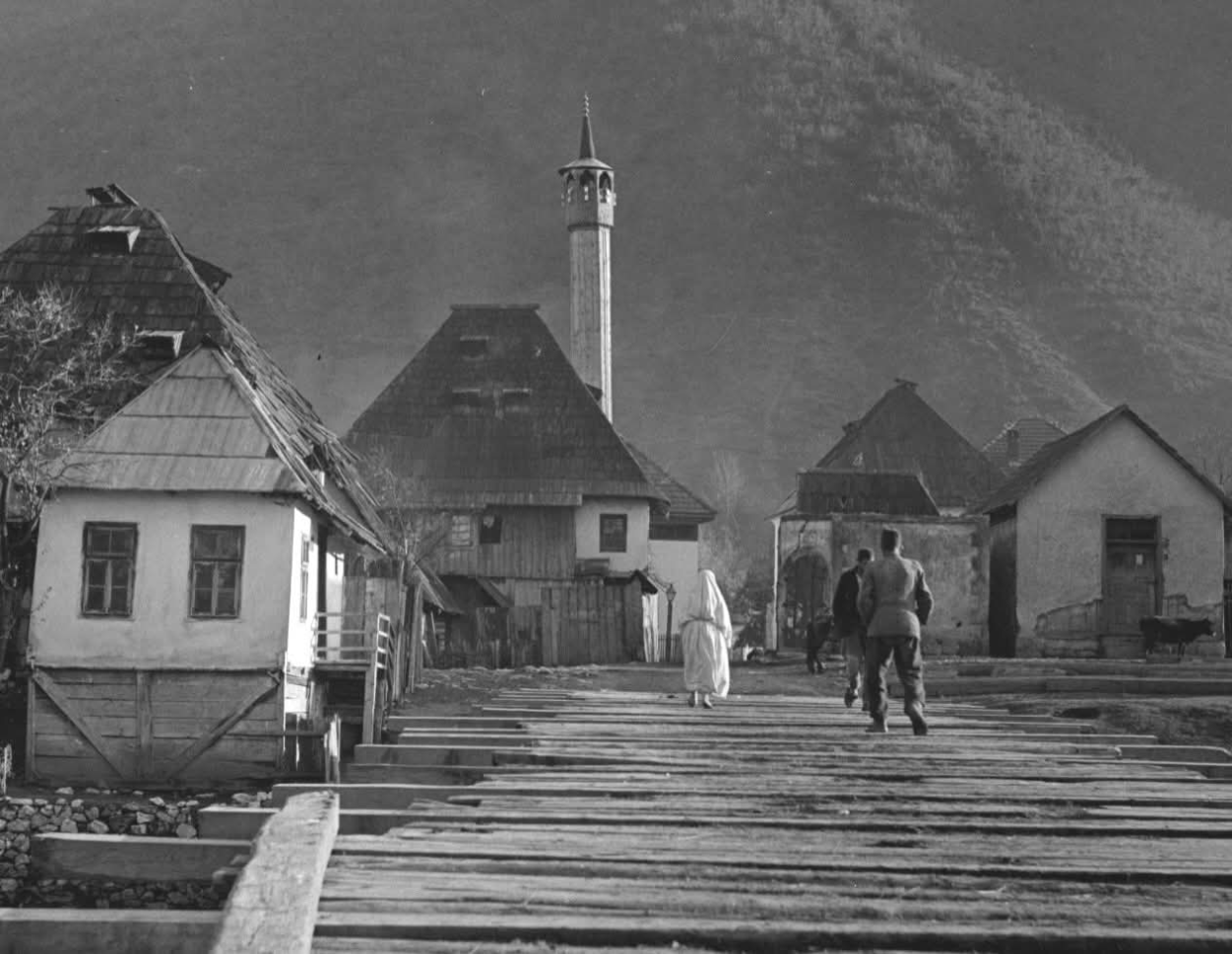 Fotografija nastala 1936. godine. Autor: André Zucca Izvor: Digitalna biblioteka kulturne baštine Pariz (Ustupio Elmir MUFTIĆ)“Do negdje 1970. godine na oba plivska rukavcima Jezeru bile su drvene ćuprije. Novo vrijeme i sve gušći promet zatijevao je čvršće mostove. Inženjer Nusret Aganović iz Jezera bio je glavni organizator i realizaror te ideje uz podršku lokalnog stanovništva, jajačke Općine i privrede, u prvom redu “Elektrobosne.” Moguće je da su mostovi građeni po zamisli ing. Aganovića koji je i izvršio proračune i nacrte,” kaže jedan svjedok. Ali, nikakvi papiri dokazi ne postoje.